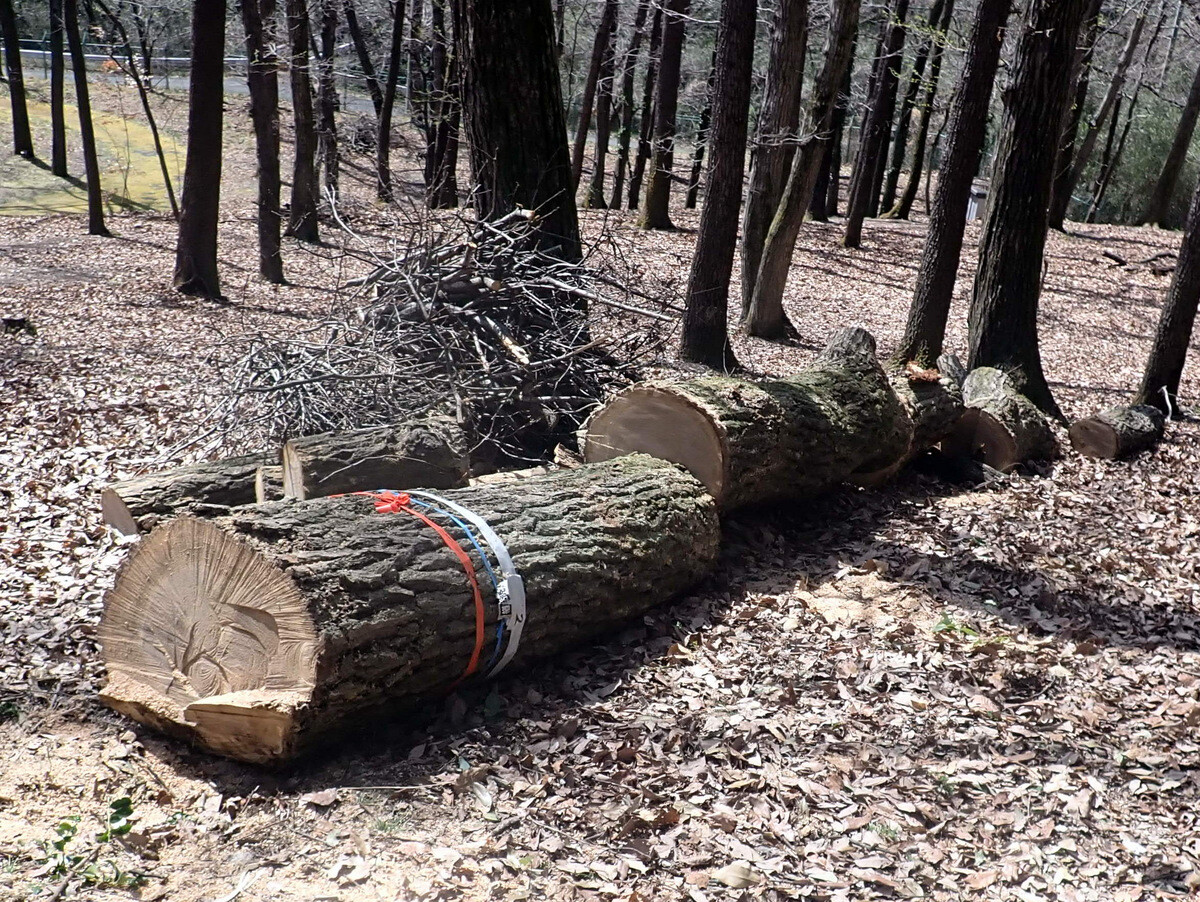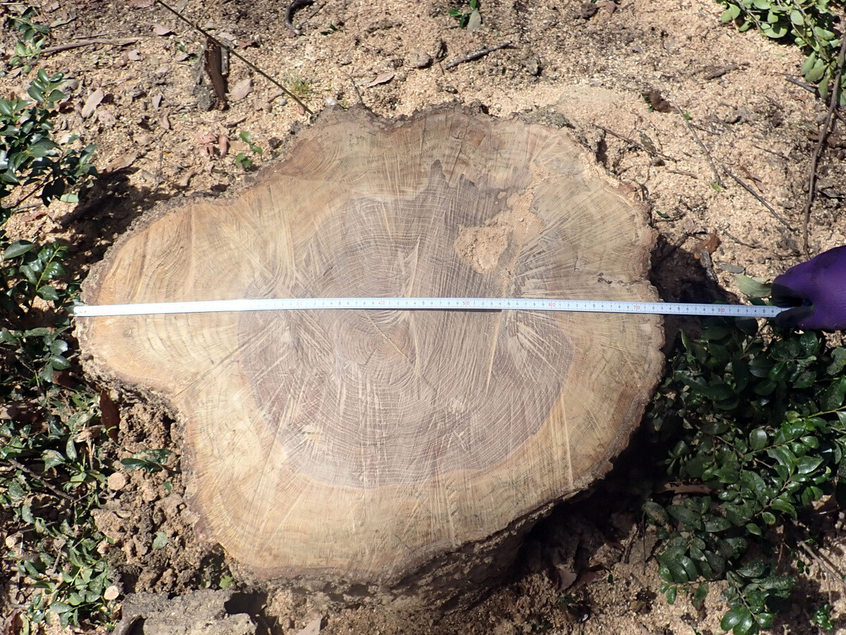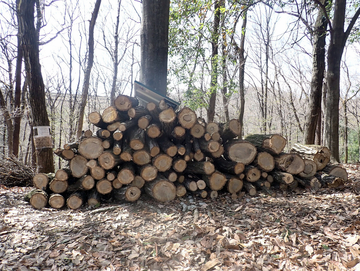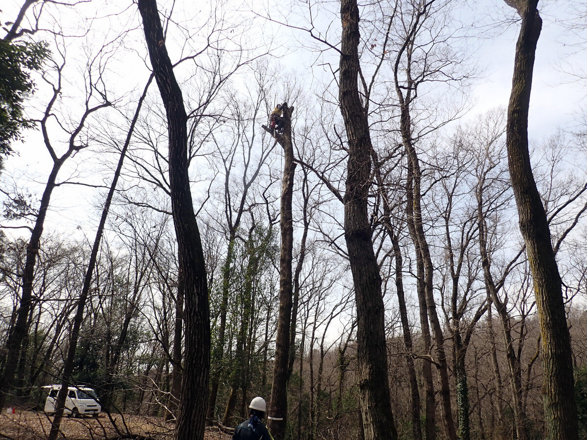 市民の森保全クラブ追加作業日。参加者は新井さん、江原さん、金子さん、鳥取さん、細川さん、渡部さん、Hikizineと新倉さんの8名でした。高坂丘陵地区ちご沢の森でナラ枯れ枯死木(№2)を伐採しました。切株の長辺73㎝の大きなコナラでした。