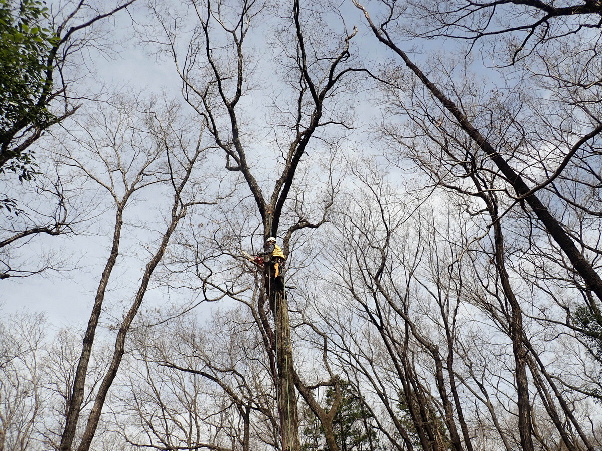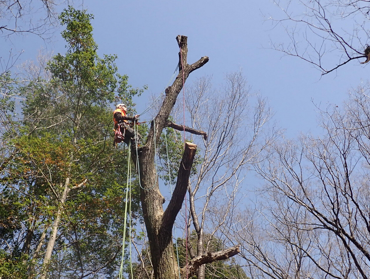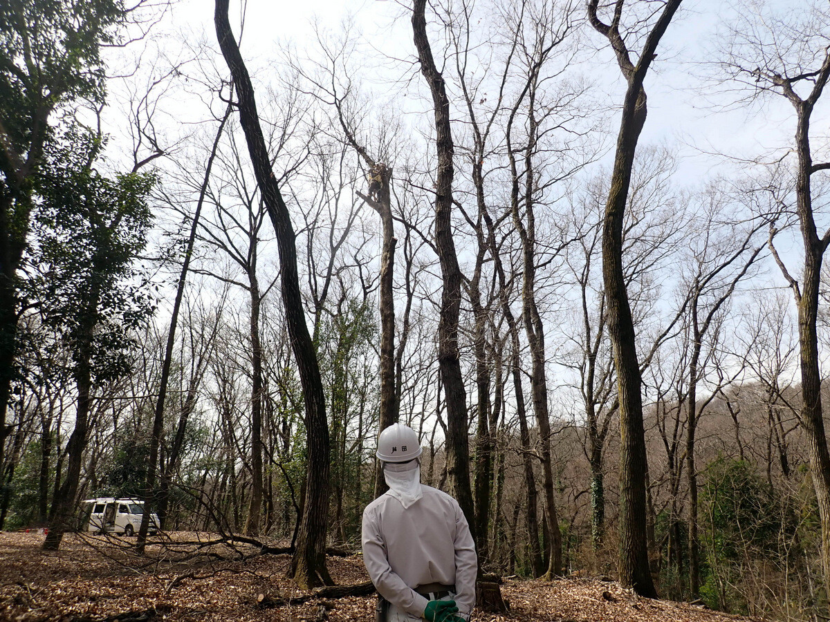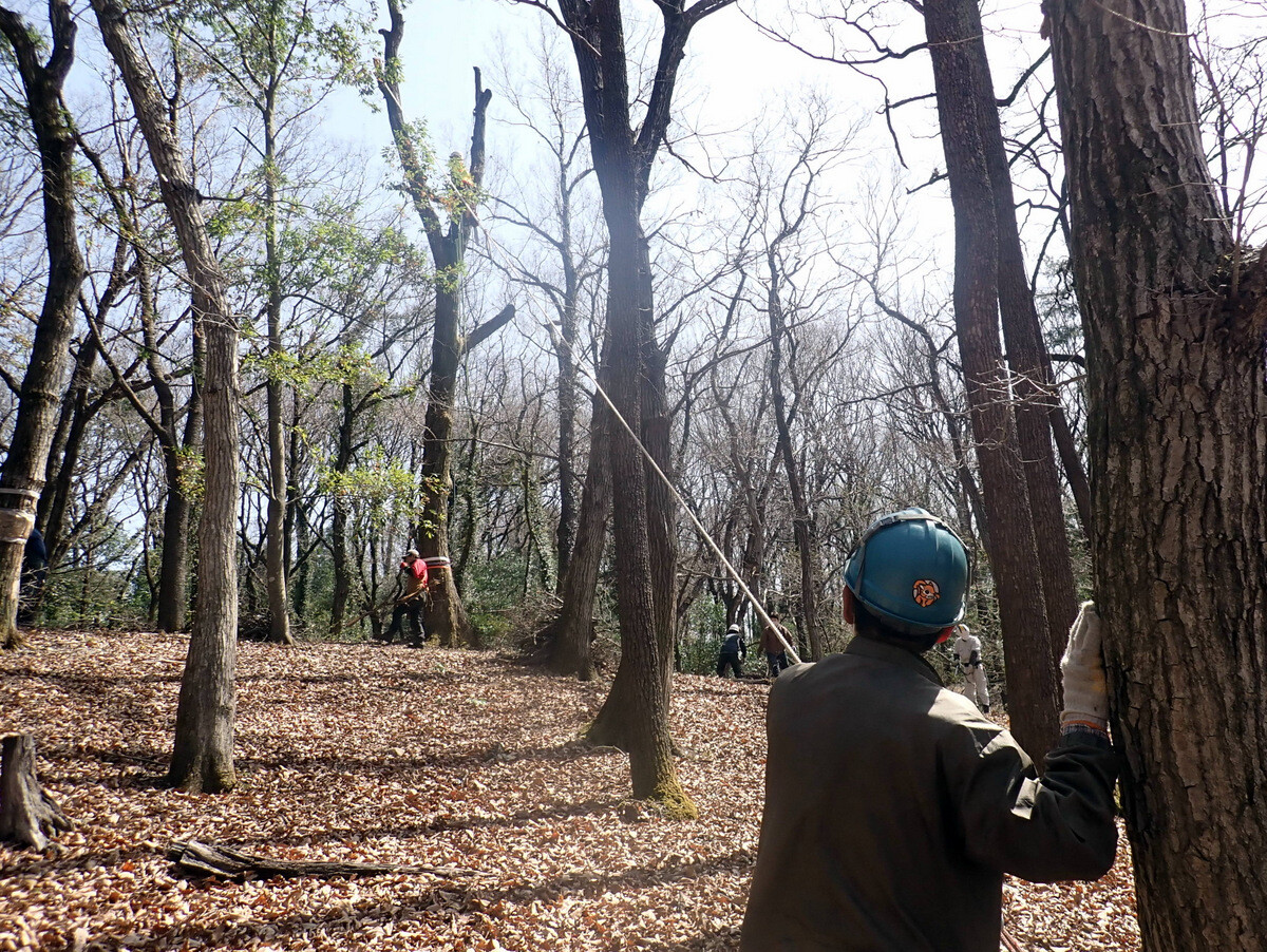 市民の森保全クラブ追加作業日。参加者は新井さん、江原さん、金子さん、鳥取さん、細川さん、渡部さん、Hikizineと新倉さんの8名でした。高坂丘陵地区ちご沢の森でナラ枯れ枯死木(№2)を伐採しました。切株の長辺73㎝の大きなコナラでした。