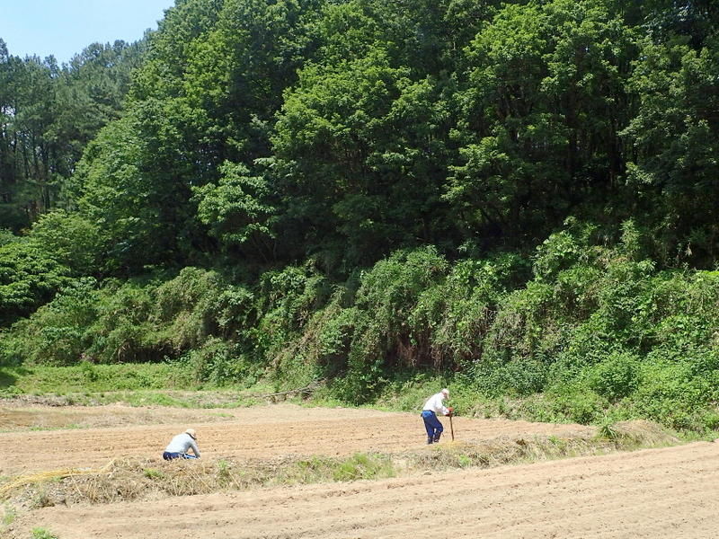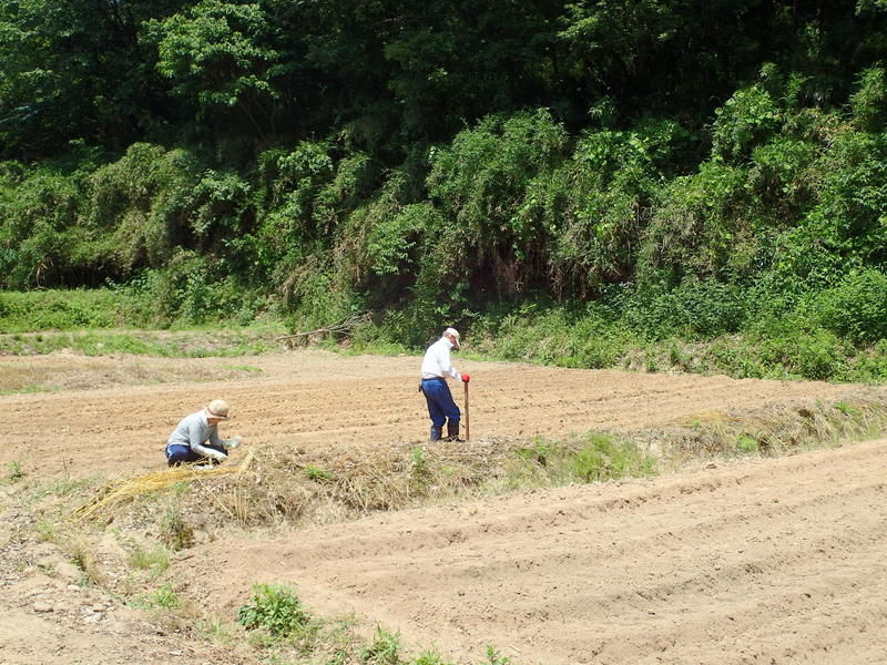 6日の夕方の降雨は、鳩山で36.5㎜、白山中学校で20㎜でした。岩殿C地区では、ボッシュ林側の水路に水が流れ田んぼにも水が入りホッとしました。ダイズ畑の畝間にも水がたまっていましたので、台風5号対策も合わせて排水溝を掘って排水しました。