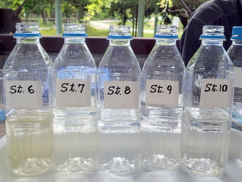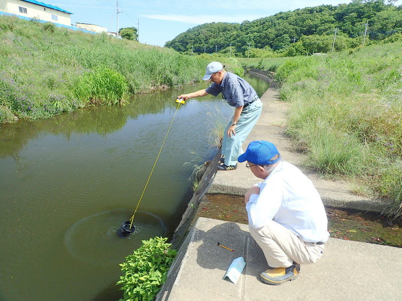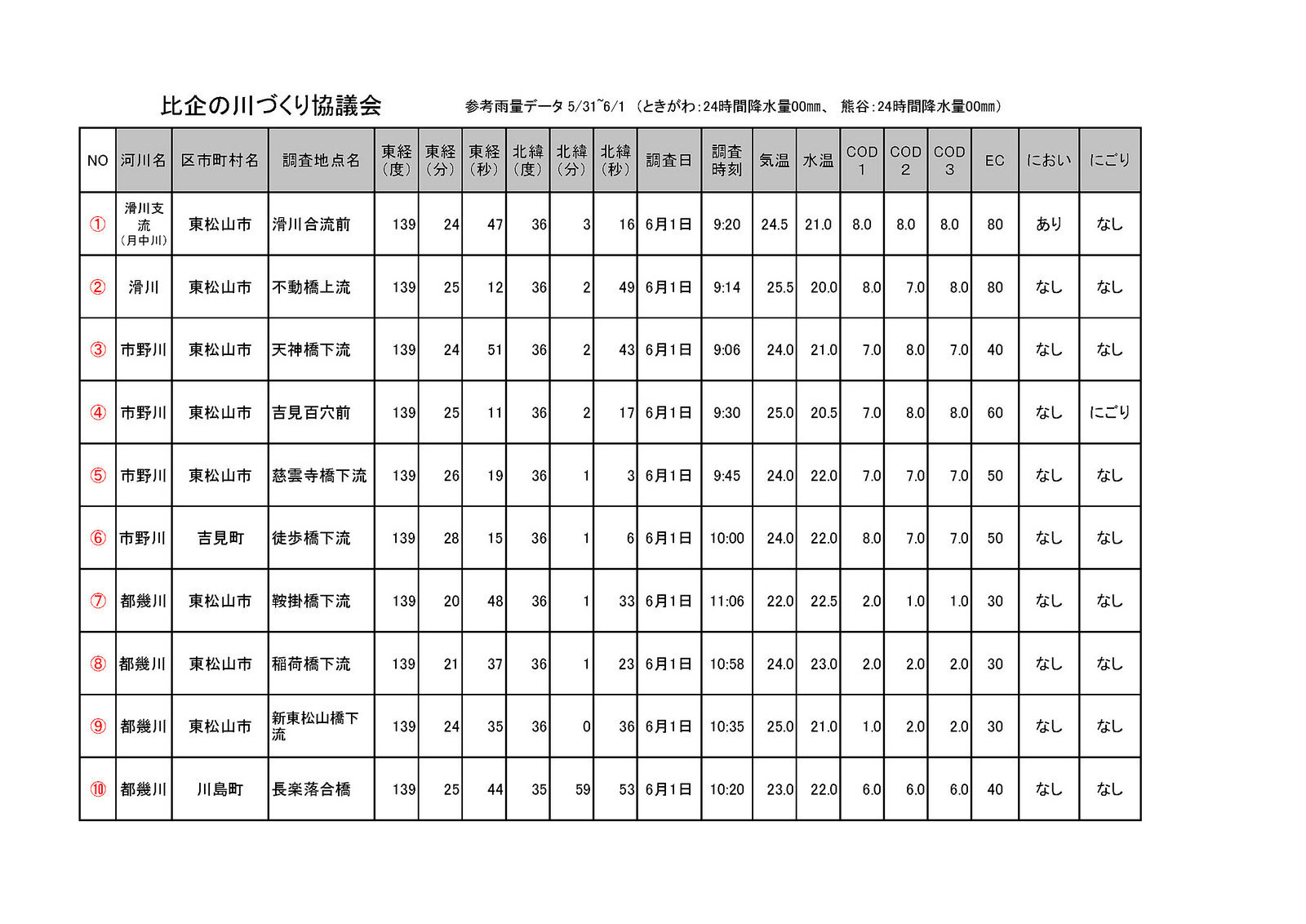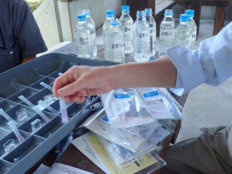 比企の川づくり協議会の水質調査に参加しました。測定結果は、NPO法人荒川流域ネットワークの2017年度荒川流域水質一斉調査(身近な水環境の全国一斉調査)にまとめられます。調査地点10箇所は昨年と同じ場所です(滑川下流1箇所、月中川1箇所、市野川下流4箇所、都幾川下流4箇所)。採水地点で気温、水温、におい、にごりの有無を判定し、くらかけ清流の郷の四阿でペットボトルに採水してきた水のCOD(Chemical Oxygen