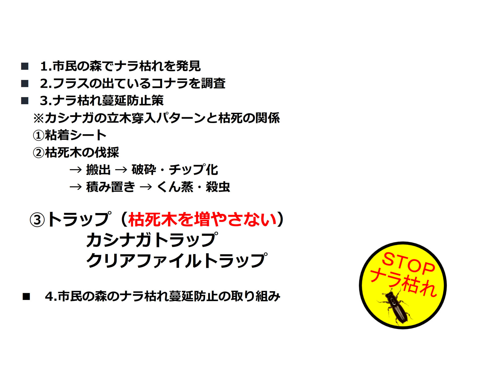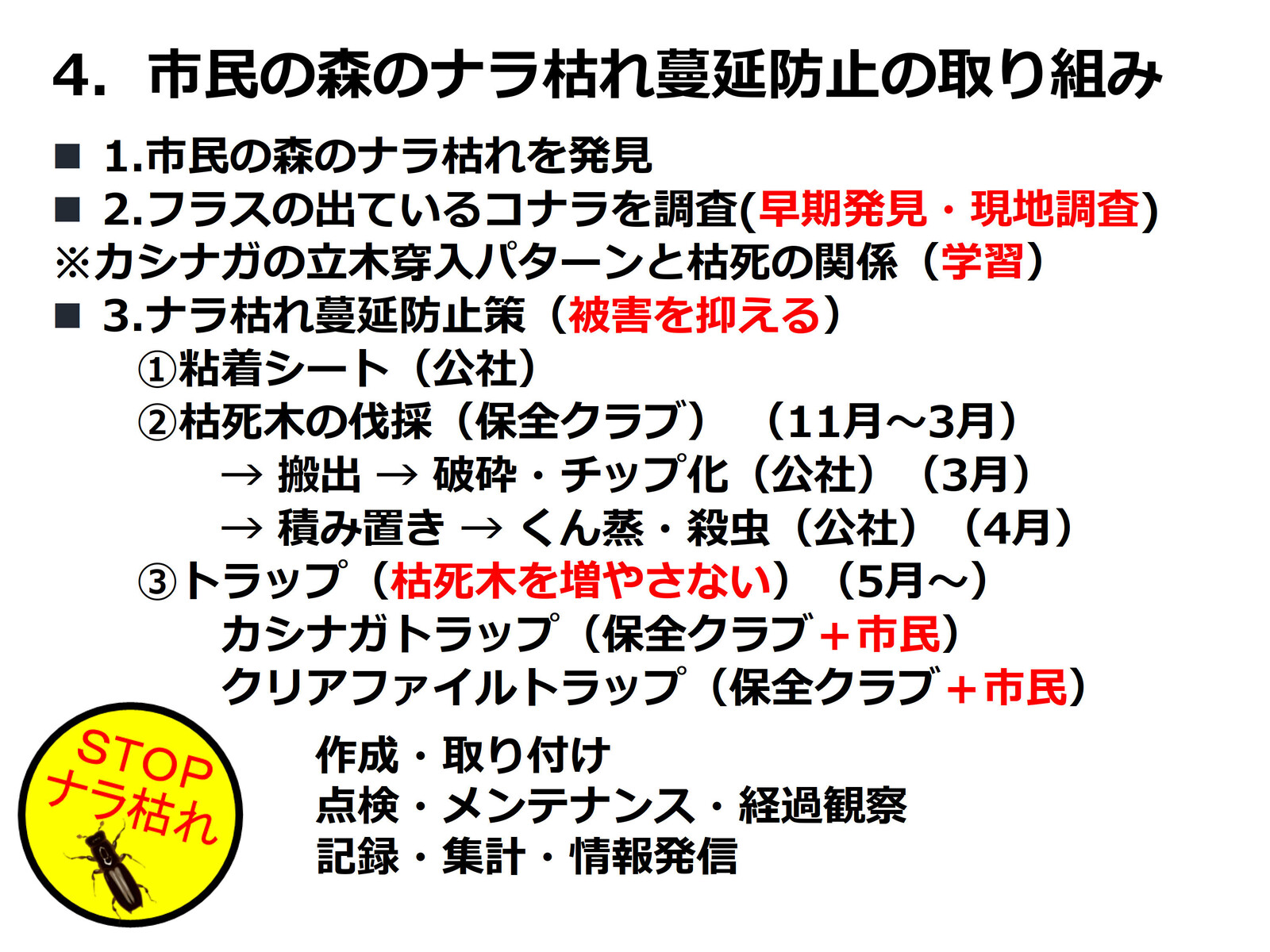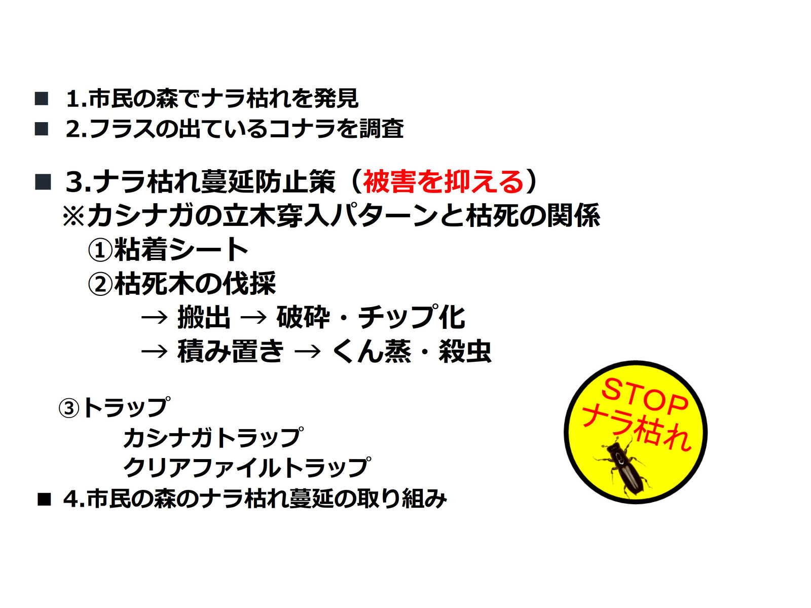 市民の森でのナラ枯れまん延を防止・ナラ枯れ防除を最優先活動目標とする。