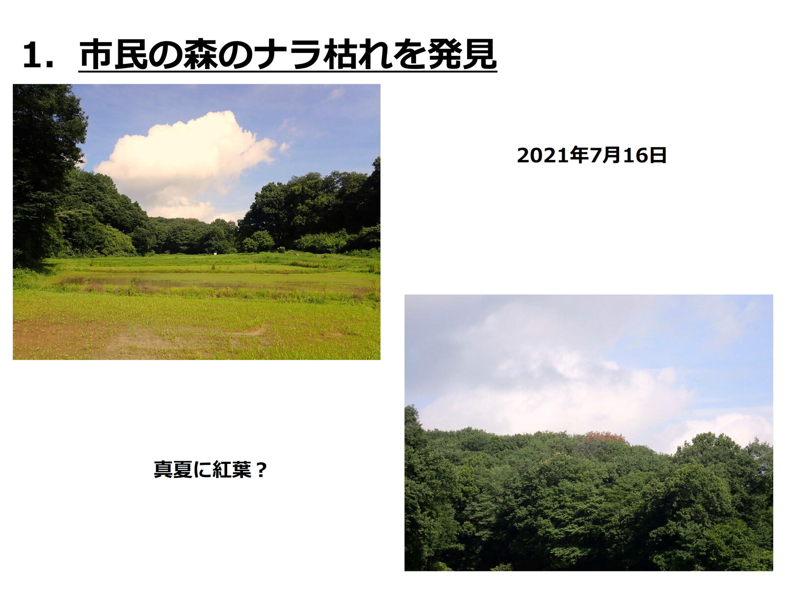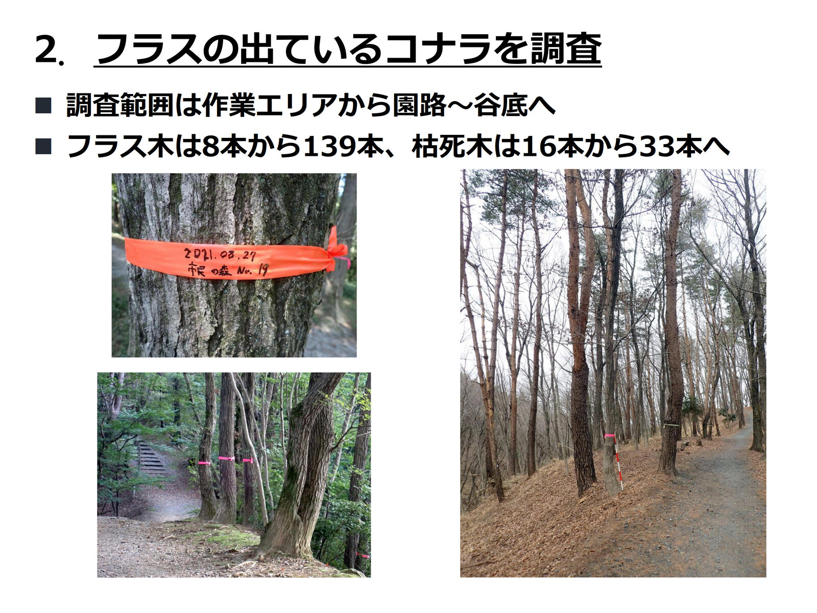 コナラ林では16年度から「市民の森のコナラ林若がえりプロジェクト」を、アカマツ林では19年度から「アカマツ林育成プロジェクト」を実施してきたが、昨年度後半、市民の森内でカシノナガキクイムシによるナラ枯れがまん延する事態となった(コナラのフラス木は判明しているだけで139本、その内、立ち枯れした枯死木は33本)。枯死木中16本は市民の森保全クラブが伐倒・玉切り。その後、業者の手で10本は年度内に搬出・チップ化、残りの6本は5月に現場でくん蒸処理される予定。