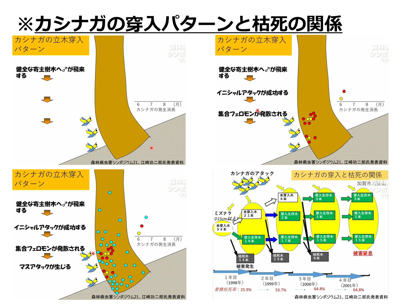 年度前半はナラ枯れ枯死木の発生を抑えるための予防活動。穿孔が始まったコナラの樹幹にカシナガトラップとクリアファイルトラップを設置してカシナガの大量捕殺を目指す(マスアタック防止のための成虫捕殺)。年度後半はコナラ枯死木内のカシナガの幼虫や成虫を殺すための駆除作業を実施。市民の森を管理する文化まちづくり公社、市役所各課、市民団体と連携して予防・駆除作業を実施し、ナラ枯れ後の市民の森づくりについても検討を進める。