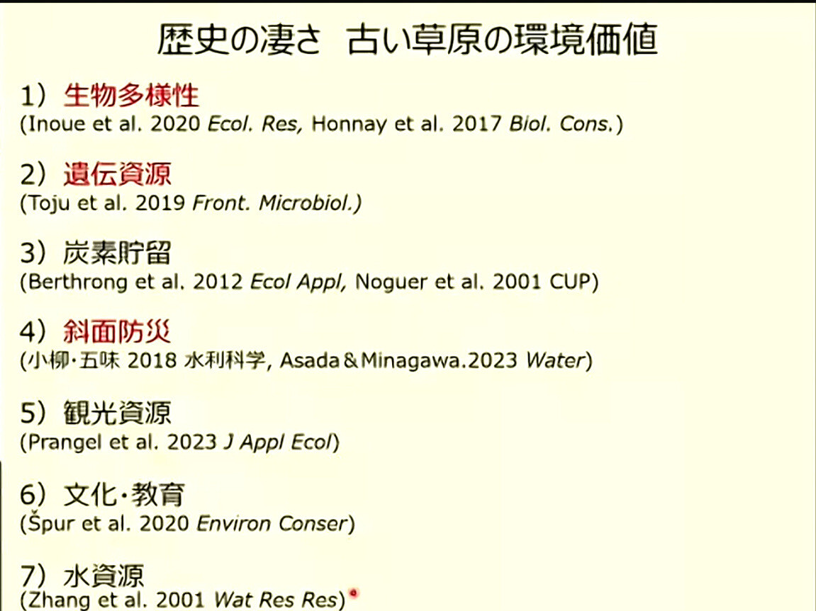 以上より、200年以上継続している草原は保全優先度が特に高く、ポスト2020年目標として国際的な注目を集めている民間保全地(OECM)の有力な候補になりうる。現在、ため池の耐震工事による植生破壊が全国的に進んでいるため、貴重な植生に配慮した工事が望まれる。