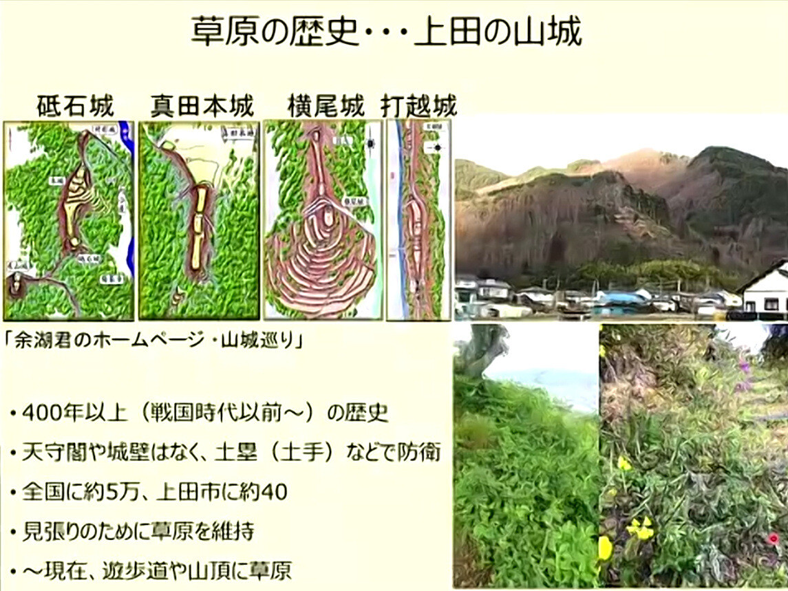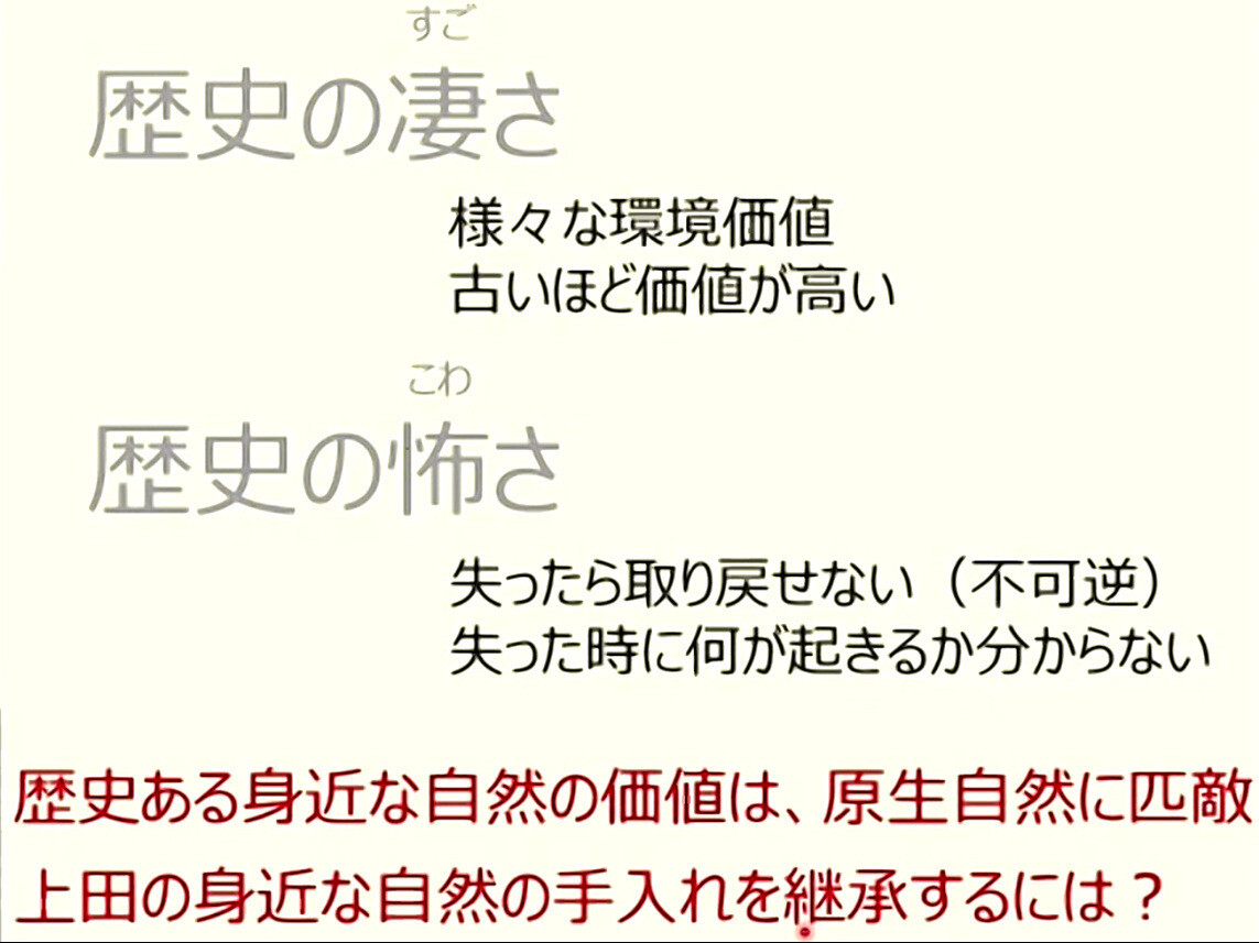 2月23日に開催されたSDGsフォーラムin信州上田「みんなで捉えろ!気候変動と生物多様性」(主催:上田市、共催:上田市環境衛生協議会、筑波大学山岳科学センター、長野県環境保全研究所)の午後の部の田中健太さん(筑波大学山岳科学センター)の講演「上田の身近な自然の魅力~高原・ため池・山城の草原再生~」です。上田市の塩田平のため池群は「日本のため池百選」(農水省HP)に選定されています。埼玉県内では比企丘陵地域が日本農業遺産「比企丘陵の天水を利用した谷津沼農業システム」(農水省HP)に認定されました。入山沼もGooglemapでは「入山沼(日本農業遺産)」としてマークされています。ため池の価値や維持管理、堰堤の植生、斜面崩壊について考えながら聴講しました。