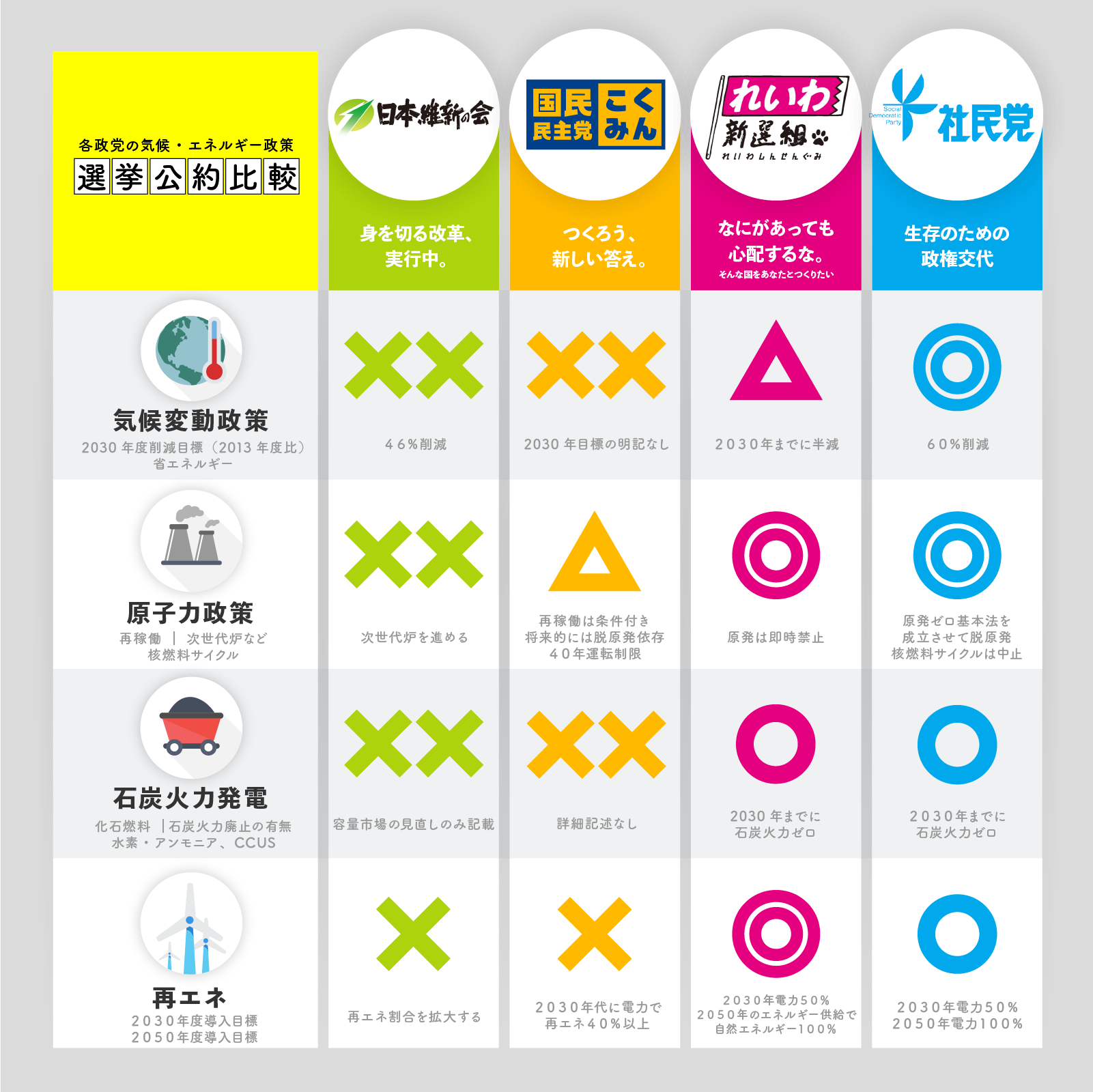 7月にeシフト・原子力市民委員会が社会民主党、れいわ新選組、立憲民主党、自由民主党、日本維新の会、日本共産党、国民民主党、公明党に要望書を提出し、各党の政策担当者と面談して意見交換をしています。今回、衆院選挙に向けて各政党の公約が発表されていますが、気候・エネルギー政策にかかる選挙公約を比較、検討し、××、×、△、○、◎の5段階で評価しコメントしました。取材者との質疑応答部分はYouTubeでは配信されていません。