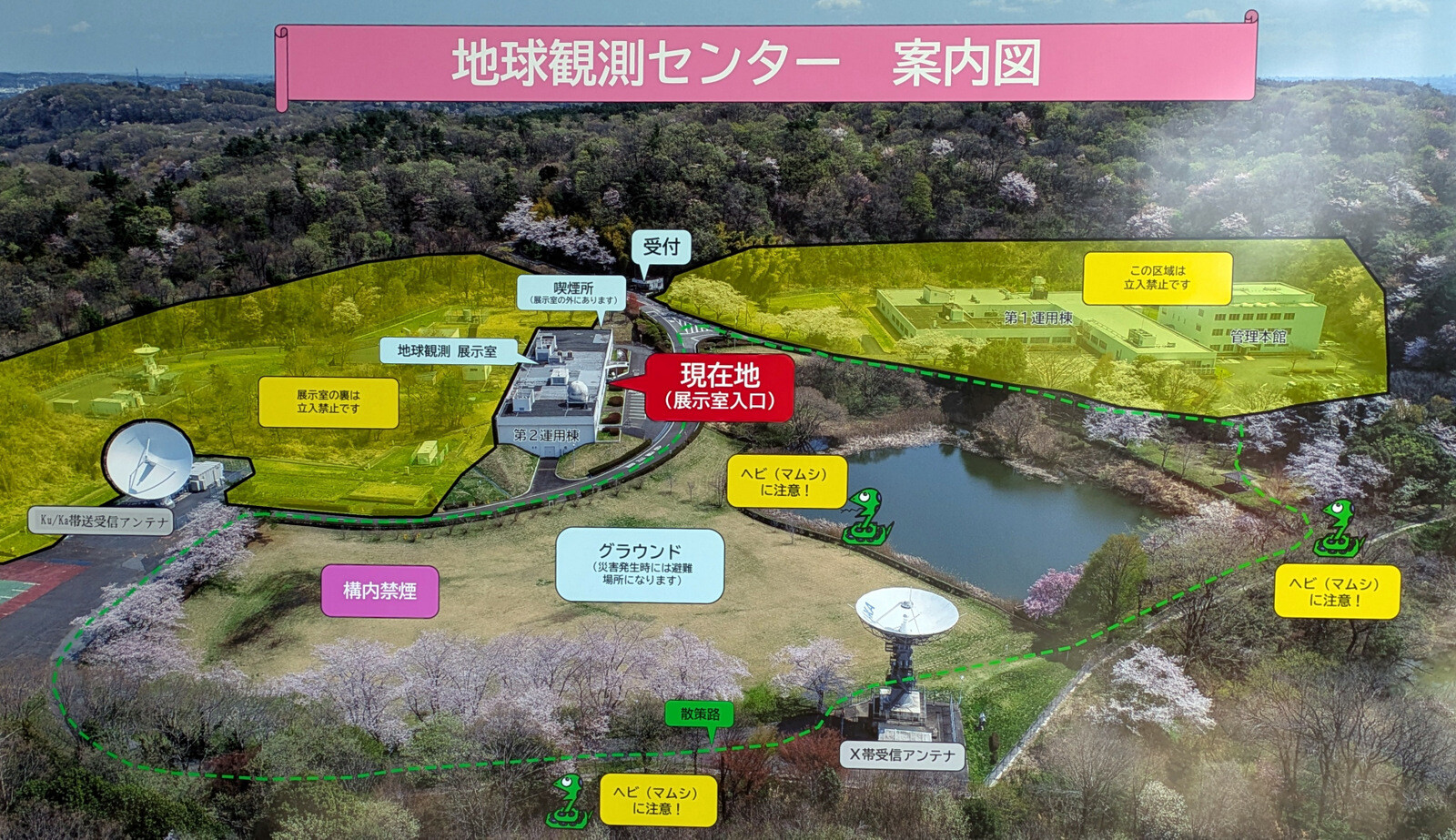 バス停下車、道沿い斜面、フェンスのつる性植物、駐車場の周囲林縁、市民の森の小径、林床、樹の花、生きものたちを観察、この日は見晴らしの丘からJAXA宇宙観測センターにも足を伸ばしました。