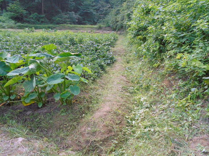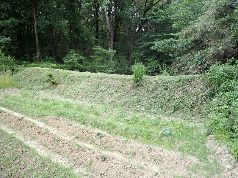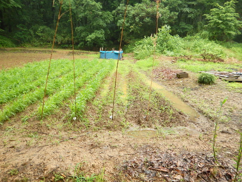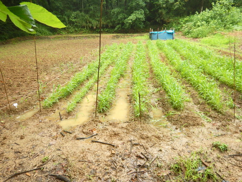 沼の堰堤の下、手前の区画にも耐湿性に優れ湛水条件でも栽培できるグリーンミレット(イネ科)と、湿害圃場の改善に効果があるセスバニア(ロストアラータ)(マメ科)とをまいてみます。