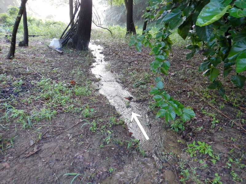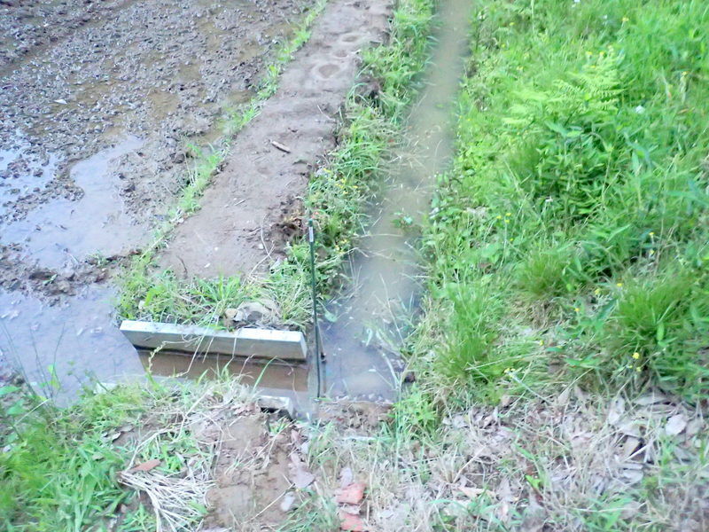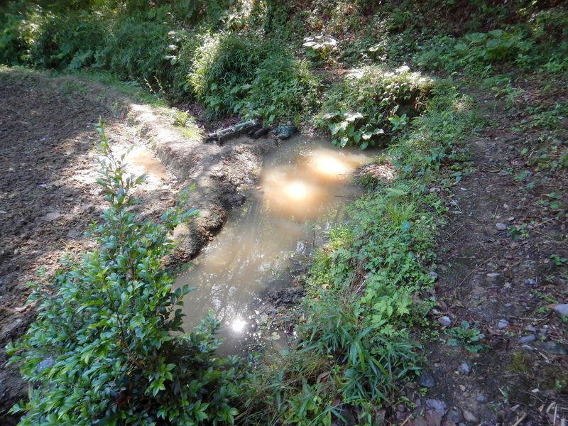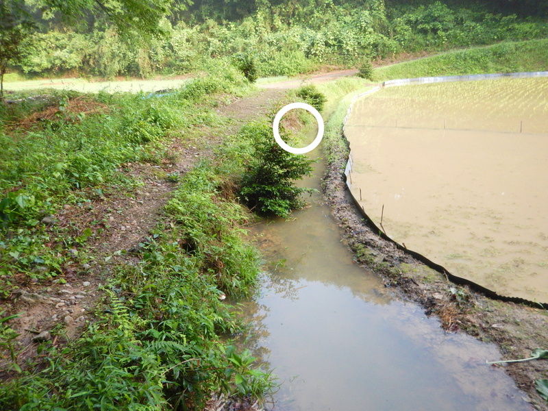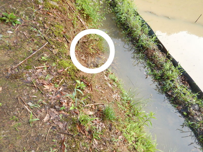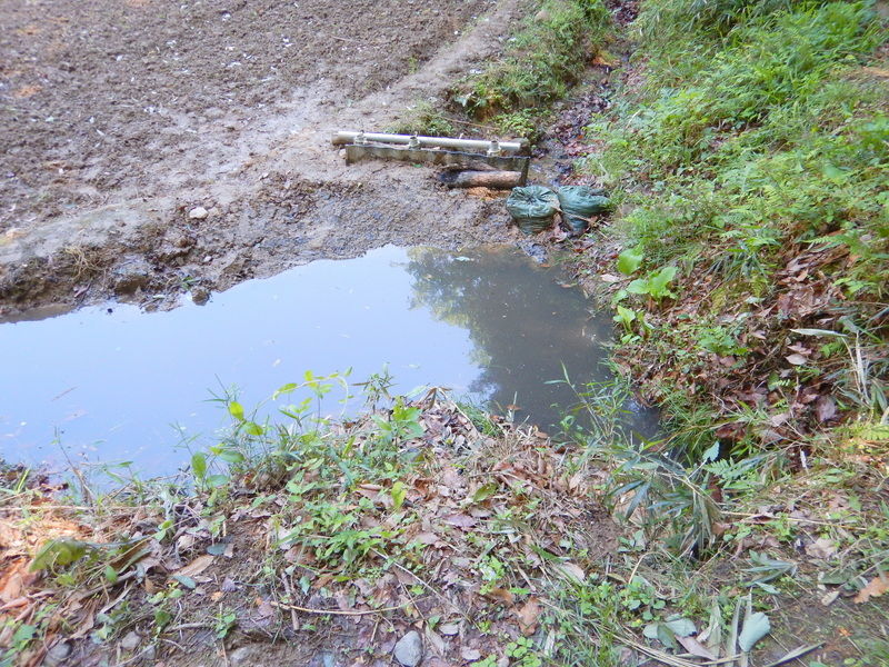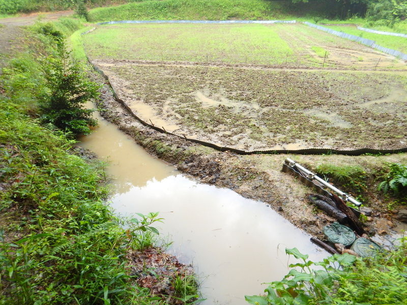 田んぼに入ってみると、長靴が沈む程度に水はたまっていました。ボッシュ林側の堰からと畑と市民の森の間の水路からの水が田んぼに入っていますが、どちらかというと市民の森側の絞り水が多いくらいです。畑への浸水防止に掘った排水用の溝を掘り直して水路に流しました。田んぼの表面の濁った水はそのせいです。