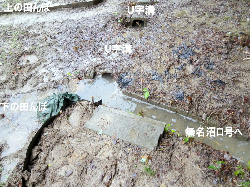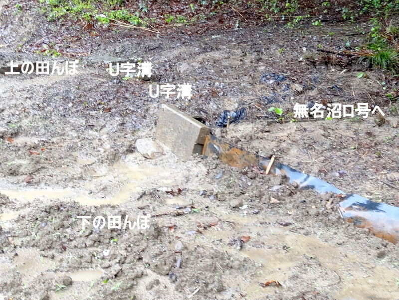 無名沼ロ号には余水吐(よすいばき)のような排水施設は全くありません。満水状態になると、行き場を失った水は下の田んぼに入ります。田んぼでは畦のすき間を押し広げながら穴を作り、F地区(耕作放棄地)に落ちています。