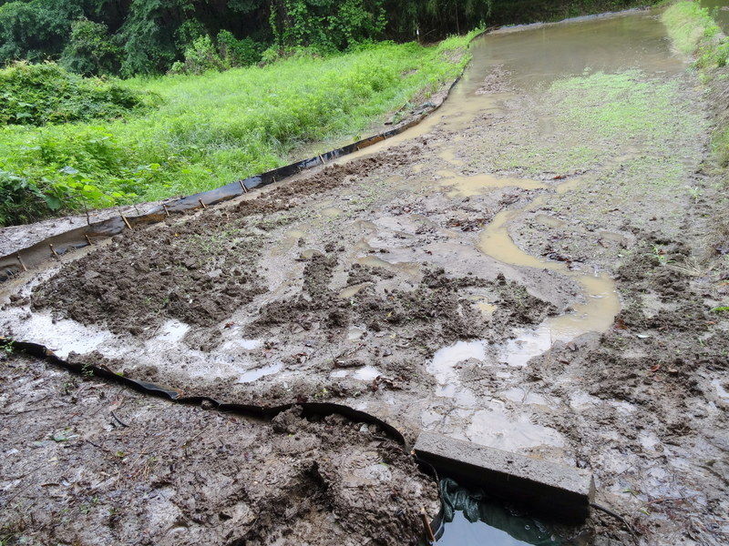 田んぼに入ってみると、長靴が沈む程度に水はたまっていました。ボッシュ林側の堰からと畑と市民の森の間の水路からの水が田んぼに入っていますが、どちらかというと市民の森側の絞り水が多いくらいです。畑への浸水防止に掘った排水用の溝を掘り直して水路に流しました。田んぼの表面の濁った水はそのせいです。