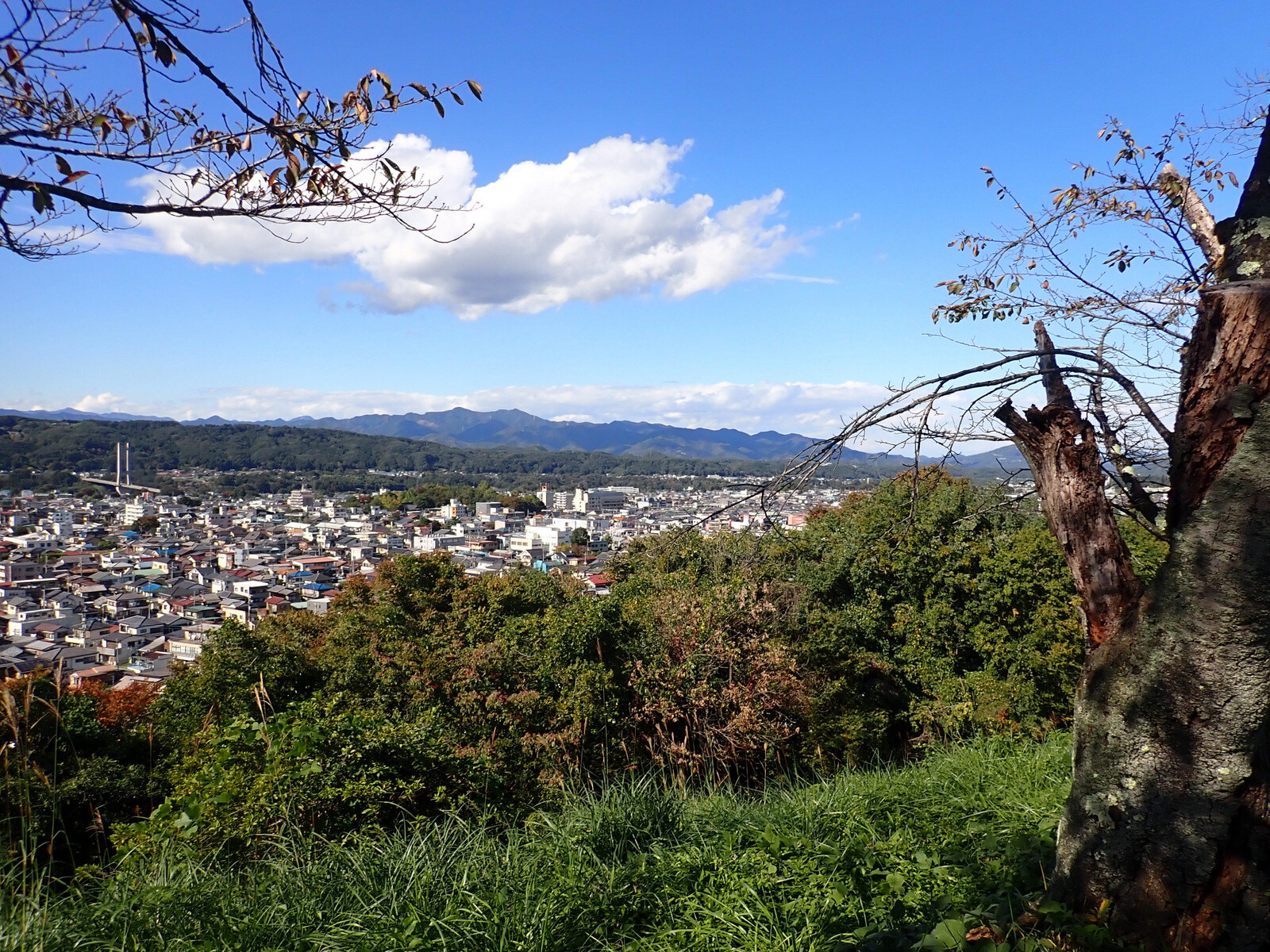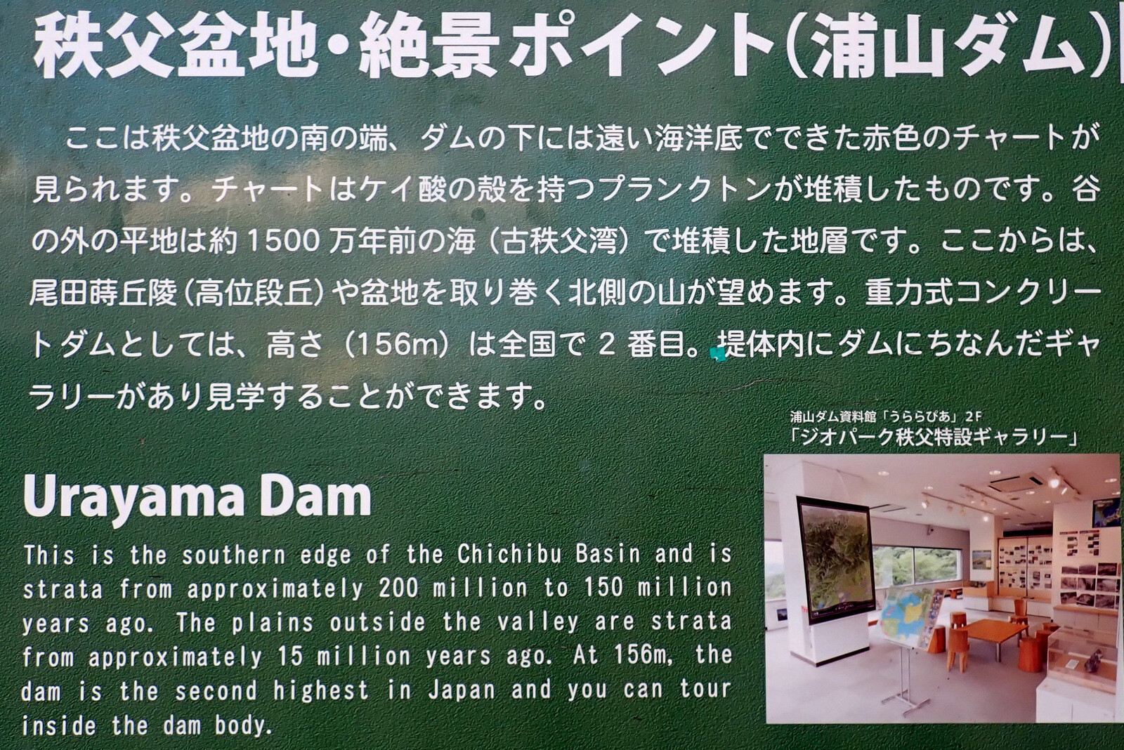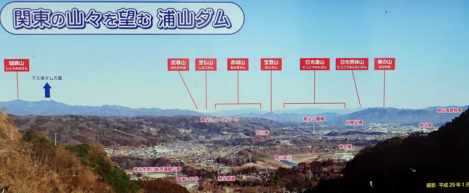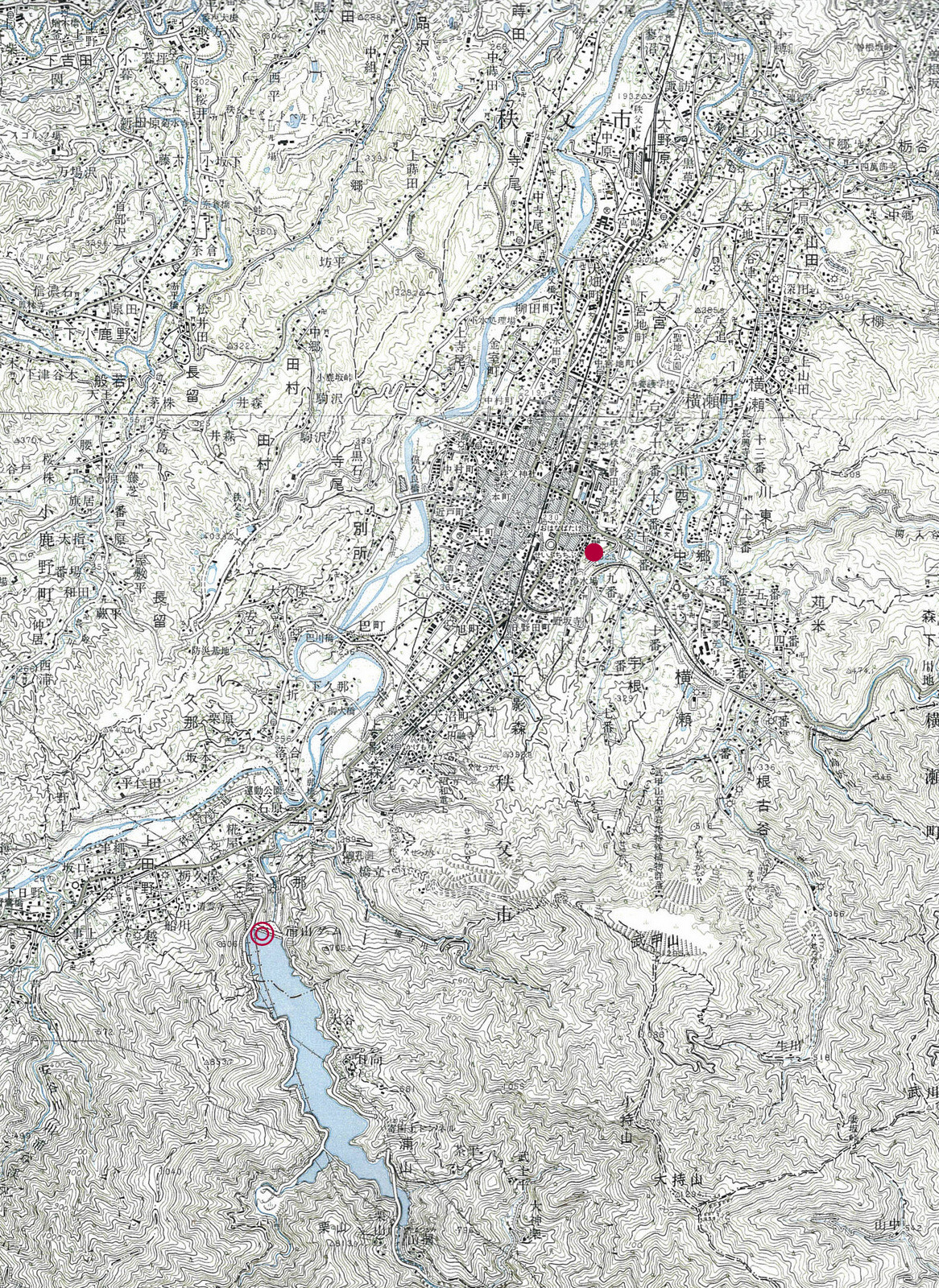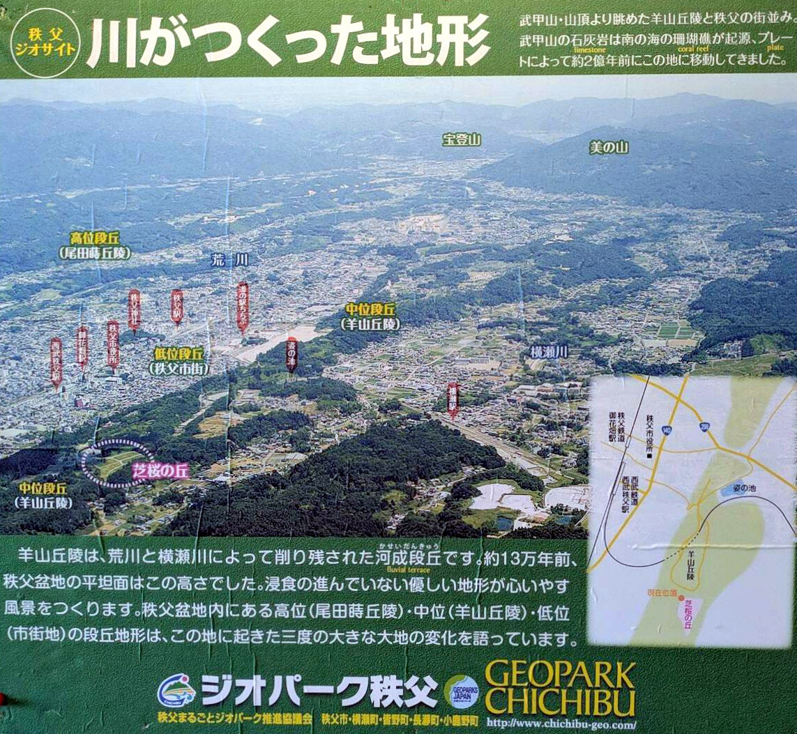 秩父市の羊山公園(●)と浦山ダム(◎)から秩父盆地の段丘地形を眺めました。秩父地域の1市4町(秩父市・小鹿野町・長瀞町・皆野町・横瀬町)は2011年にジオパーク秩父として、日本ジオパークに認定されています。羊山公園はジオサイト、浦山ダムは眺望サイトの一つです。