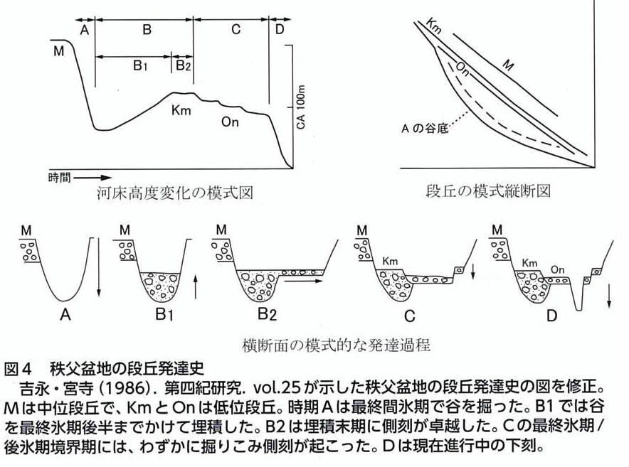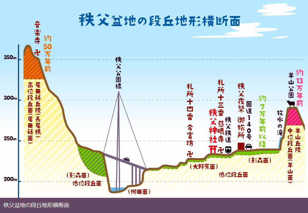 秩父市街地が載る段丘面の地下には過去の荒川が運んだ砂礫の地層がある。その厚さは部分的には葯30mもあり、砂礫で埋もれた「谷」が存在する。これは、葯12.5万年前頃の温暖期に荒川が流れていた谷の名残である。約10万年前頃から地球の気候は徐々に寒冷化して日本列島に接近する台風の数が減り、荒川の洪水の頻度や流量は減少した。その結果、運ばれきれなくなった土砂が堆積して荒川の河床が上昇し、温暖期の谷は埋められて広い河原ができた。