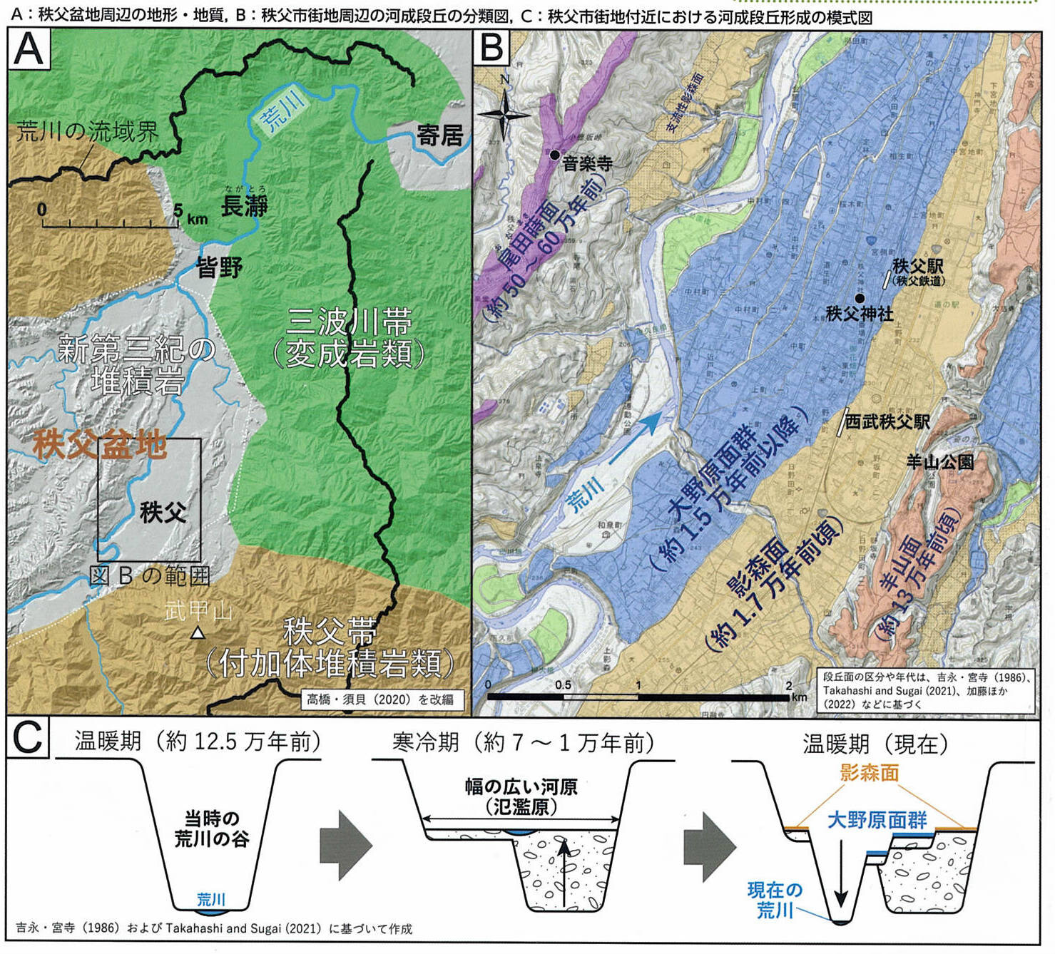 その後、約1万年前頃から気候は再び温暖化に転じ、降水量が増加したことで荒川は再び谷を掘り始め、現在の地形ができた。秩父市街地が載る段丘面は、現在よりも寒冷な時代に荒川が高所につくった広い河原が由来である。荒川の段丘は、日本列島における氷期(寒冷期)・間氷期(温暖期)という長期的な気候変動によって形成された河成段丘の典型例である。