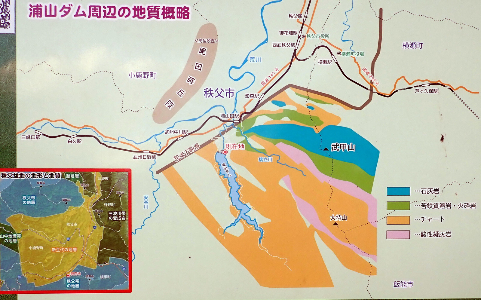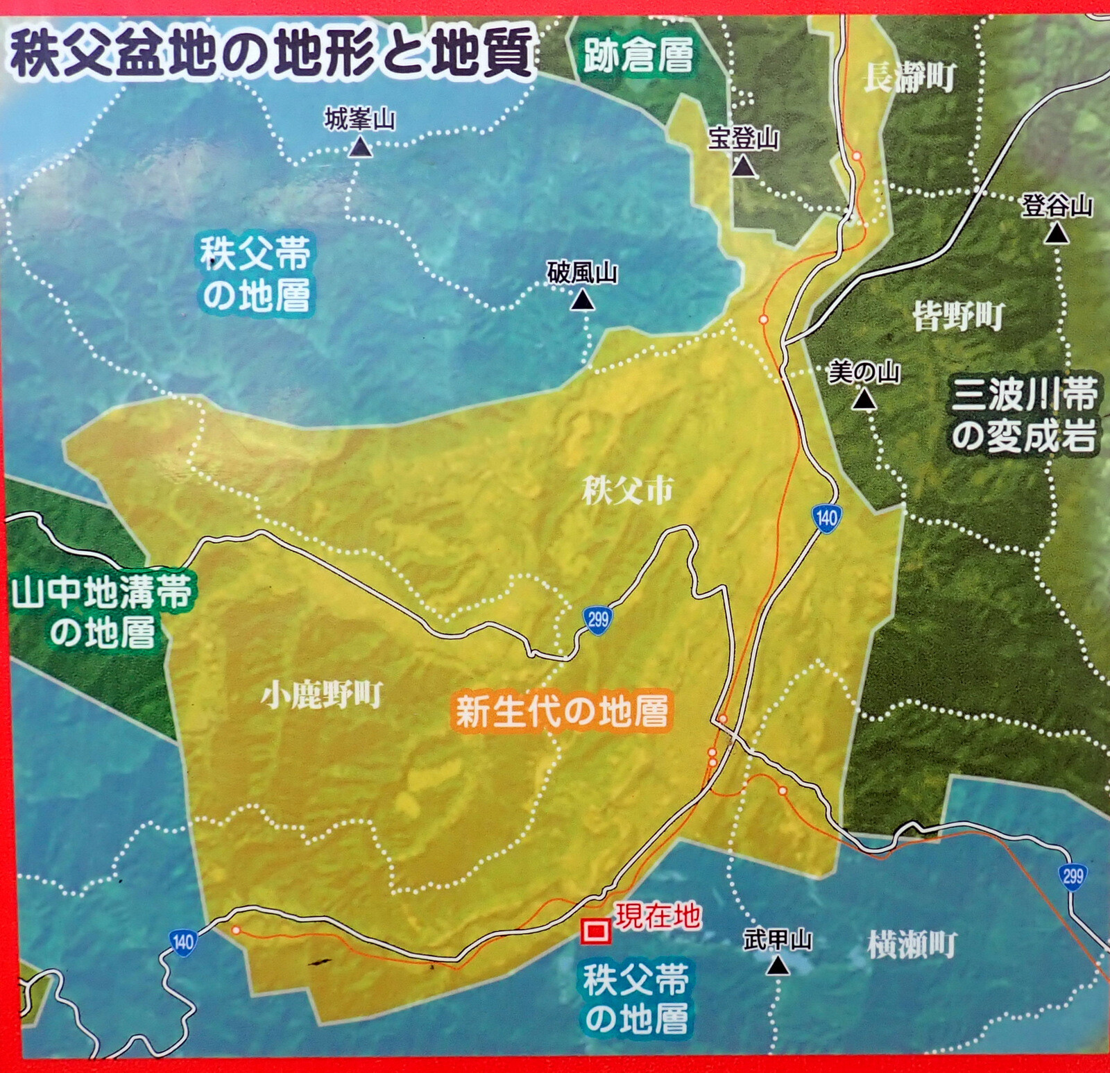 しかし、なぜ関東山地の中で秩父盆地にだけ広い段丘面があるのか?それは、基盤の岩石の硬さの違いに原因がある。秩父盆地周辺の岩石は新第3紀の比較的軟らかい砂岩や泥岩である一方、下流の長瀞付近には相対的に硬い変成岩が分布する。関東山地の中の岩石が少し軟らかいところに、ぽつんと窪んだ秩父盆地と段丘が広がったのである。