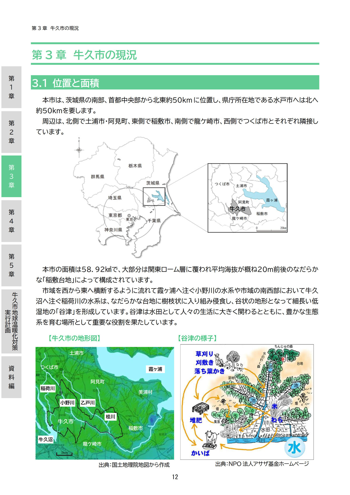 …結束集落は、天正期(1573~1592 年)に成立したとされる。集落の面積は約 100ha であり、北方に位置する小野川、東西の谷津を他集落との境界とする。人口は、明治期より 70~90 人程度で推移している 。林野は台地の斜面に位置し、緩やかな傾斜の平地林である。本研究では、農用林として利用があった時代を 1960 年代までとし、その中でも 1950 年前後を「農用林時代」と定義し分析する。1960 年代には、牛久市の農村集落においてプロパンガスと化学肥料の普及が進んでおり 、その後、農用林の管理は放棄されたと考えられる。…また、得られる文献資料や、集落古老の記憶が 1940年代以降に限られることに加え、事例地を含めた現牛久市周辺の土地利用が都市的なものへと変化するのは 1950 年代以降と報告されている。従って、1950 年前後の状況に絞って調査を実施する。自然観察の森は 1990 年から開園しているが、開園から 20 数年が経ち、維持管理の作業行程や作業頻度が固定化した 2013 年前後を「公園緑地時代」と定義し分析する。(2.研究対象の概要から引用)