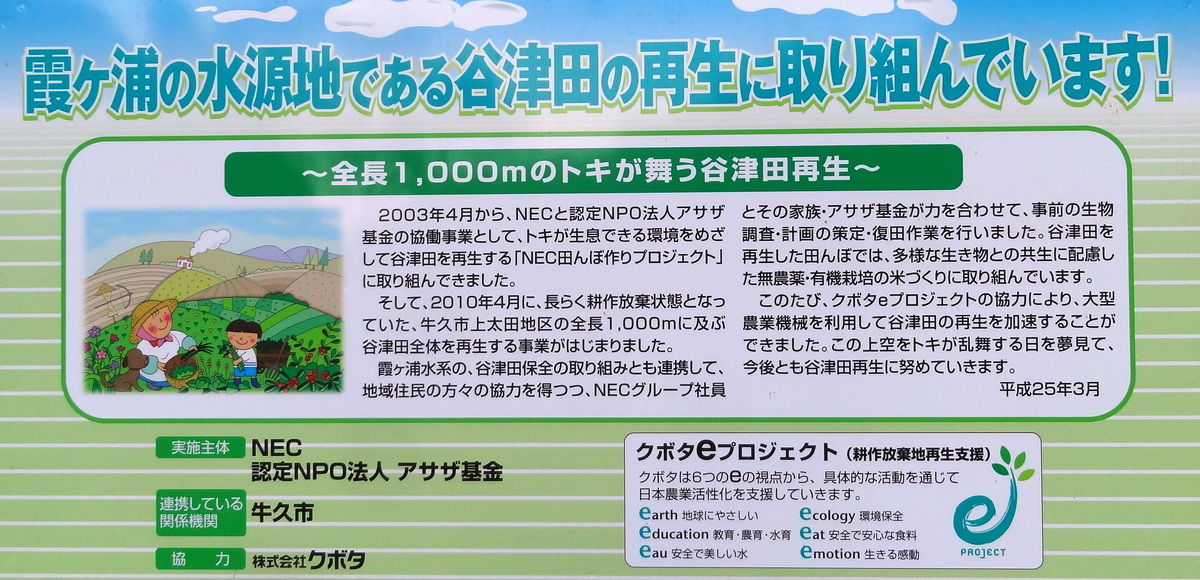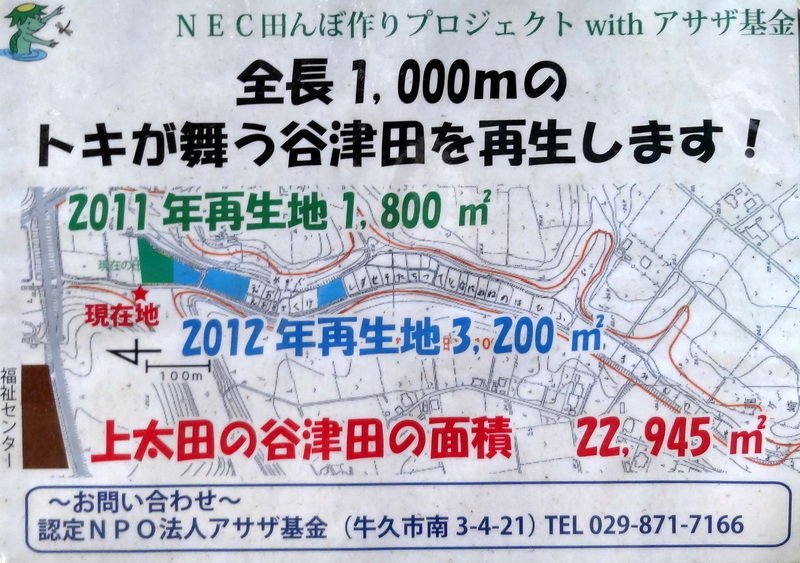 広さは、約4.4反歩(約4400平方メートル)。場所は、霞ヶ浦の北西の入江・高浜入りの近くにあります。『谷津田の最奥部をNEC社員の環境意識啓発の場として復田』したところです。事業の内容は勿論ですが、掲示板やトイレ、施設など岩殿の遊休農地再生活動の参考になればと思います。
