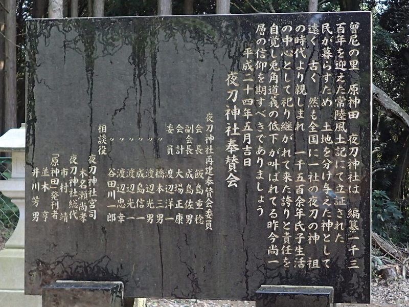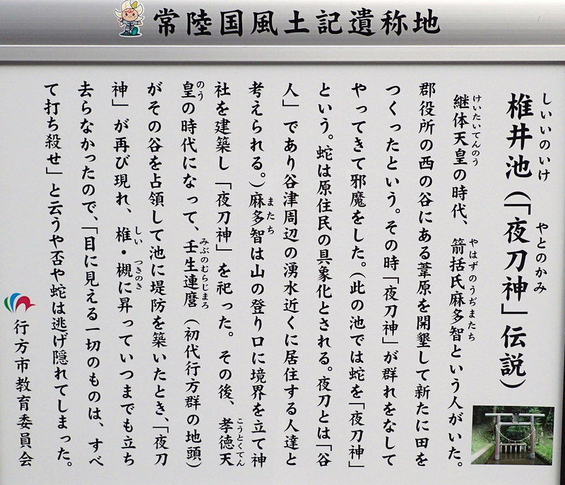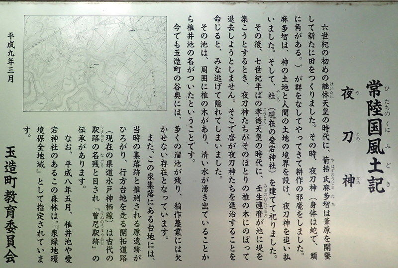 「常陸国風土記」の行方郡の条は、古代における耕地開発の歴史 を語ったものとして歴史家の間では有名なものである。「風土記」の伝えるところでは、継体天皇の時代に、箭括氏麻多智【やはずのうじのまたち】という男が、行方郡の谷地を開発しよ うとして「夜刀の神」といわれる蛇体の神と闘争し、「山の口」に掘った「堺の堀」に堺の印となる棒杭を立てて「神の地」と「人の田」の境界とし、蛇神のた めには神社を設けて祭ったという。そして、孝徳天皇の時代には茨城の国造の地位にあった壬生連麻呂【みぶのむらじまろ】が、この谷に池を築いてさらに本格的な開発に乗り出し、 「池の辺の椎の樹」に昇り集まって抵抗する蛇体の神を排除して池堤の構築を完成させたという。夜刀神社は愛宕神社の本殿の隣に合祀されていますが、かつては、現在地の南200m程隔たった台地の縁辺、字滝の入に鎮座していたそうです。