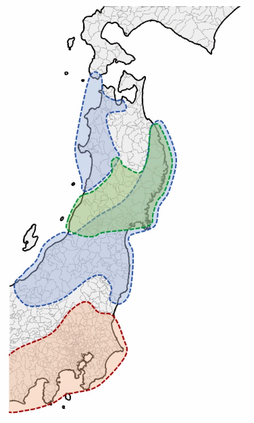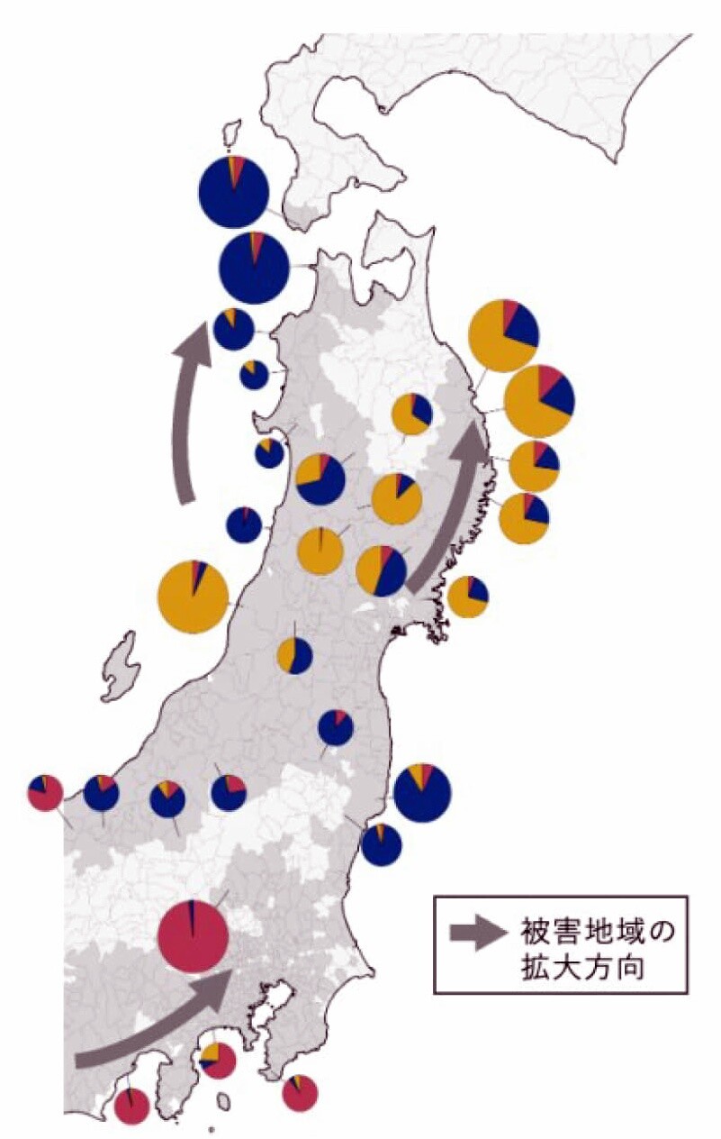 北東北3県(岩手・秋田・青森)におけるナラ枯れ被害は、近年急速に拡大、特にミズナラやコナラなどのナラ類が多く分布する地域で深刻な影響が出ている。ナラ枯れが発生する可能性の高い地域をあらかじめ把握しておくことは重要。東北地方でナラ枯れの被害が激化しやすい ミズナラ、カシワ、コナラ 、クリ等がどこに分布しているか、ミズナラ、コナラ、ブナ、針葉樹人工林、マツ類、その他を凡例として色分けした植生分布図が作成されている。近藤洋史・斉藤正一「ナラ枯れ被害に対応した東北地方の森林植生マップの作成」(『山形大学紀要(農学)』19巻4号、2025年2月)142頁東日本でのナラ枯れ拡大、近隣の既存被害地からの移住により分布拡大