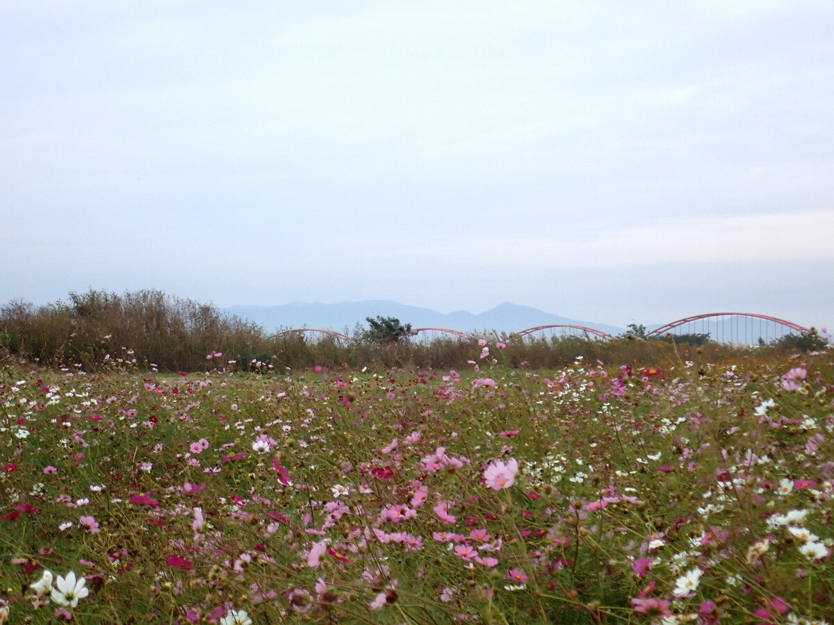 日本一長い全長1101mの水管橋を右にみて大芦橋を渡って、荒川左岸、鴻巣市吹上地区明用[みょうよう]のコスモス畑に行きました。1200万本だそうです。